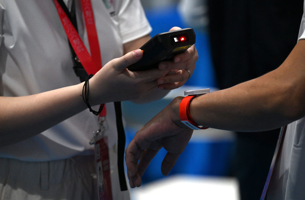↑11月8日,在前置安檢區(qū),工作人員在查驗各代表隊跨境手環(huán)。