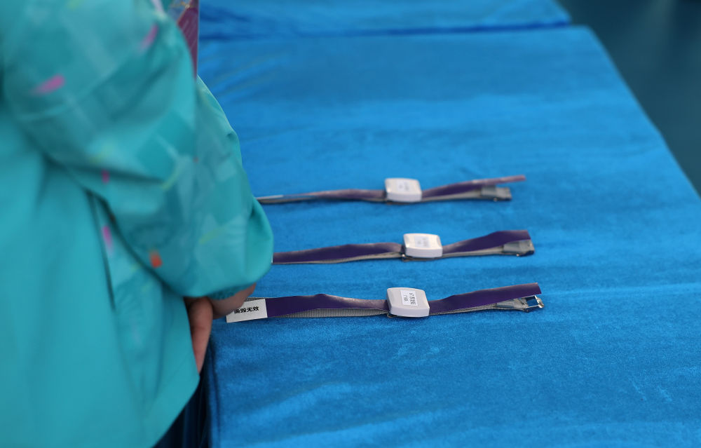 ↑11月8日,志愿者為參賽隊員佩戴跨境手環(huán)。