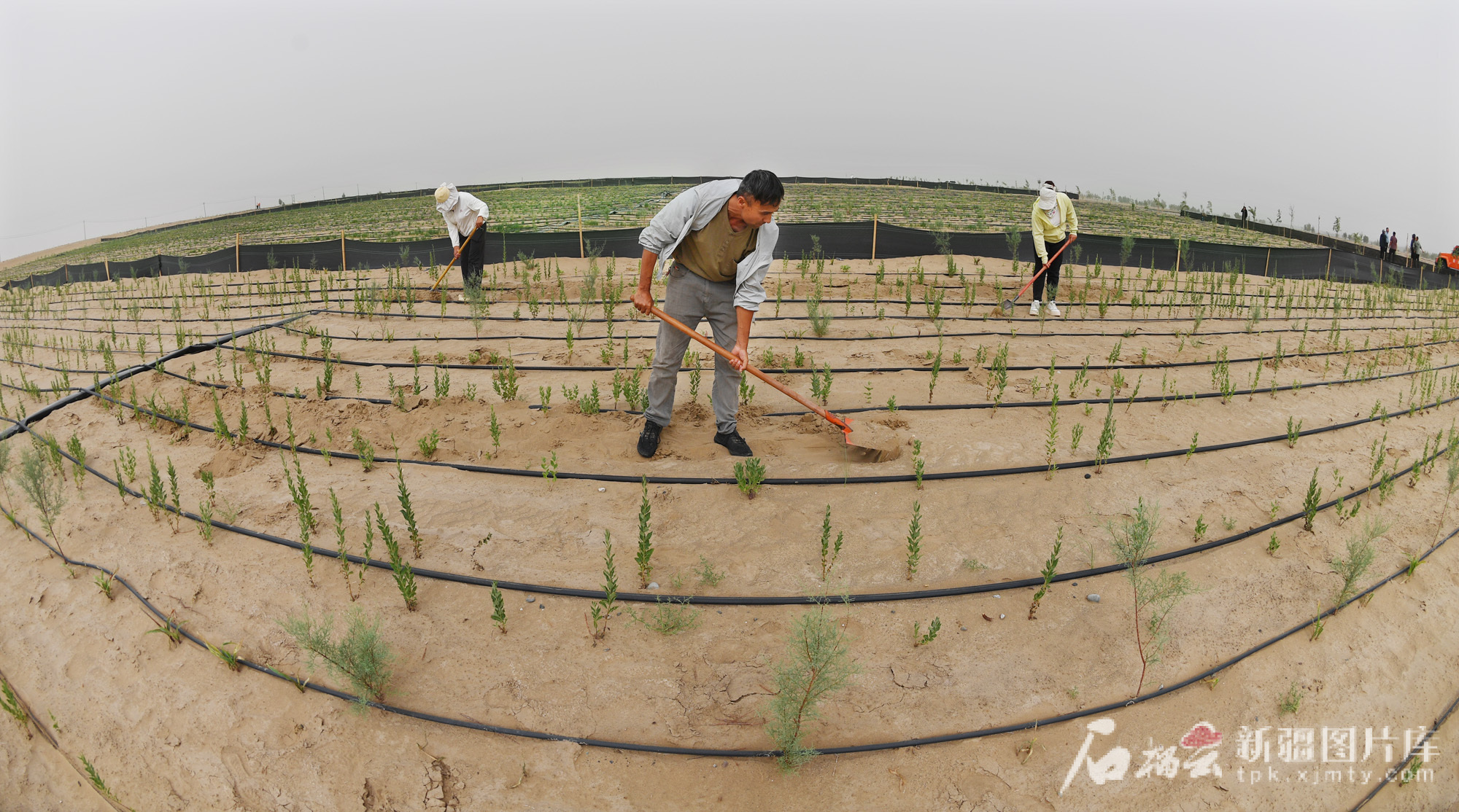 6月15日,在民豐縣后河壩沙漠阻擊區(qū)的防沙治沙試驗(yàn)站,工人在沙漠里進(jìn)行桔梗補(bǔ)植、管護(hù)等田間作業(yè)。