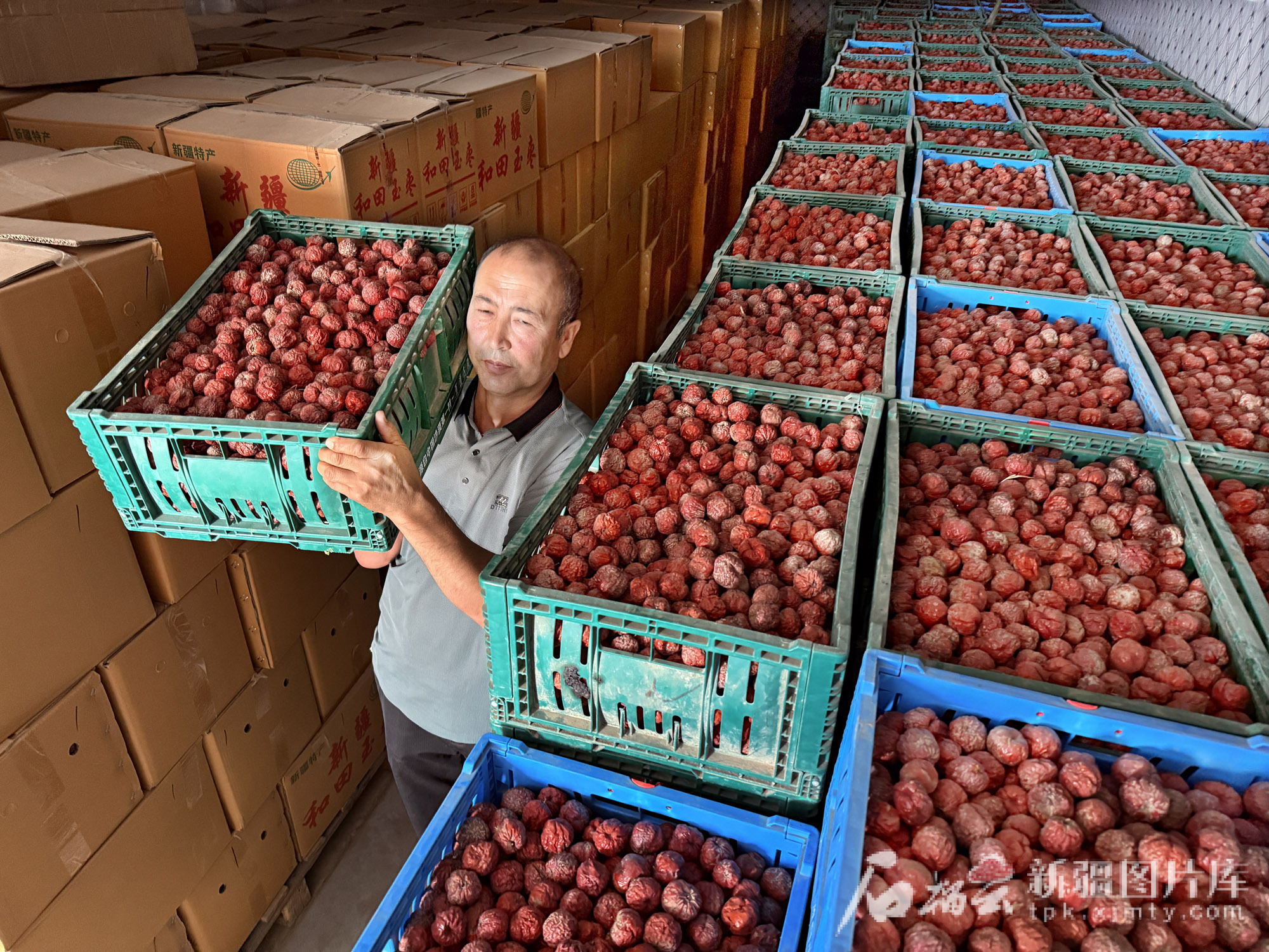 6月15日,工人在民豐縣后河壩沙漠阻擊區(qū)的紅棗基地冷藏室搬運(yùn)準(zhǔn)備加工的紅棗。