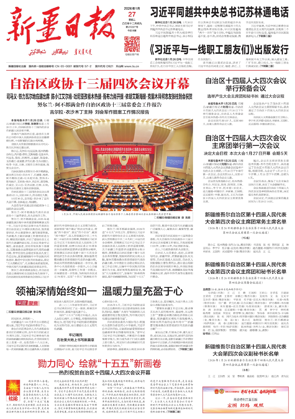征程萬里風(fēng)正勁,重任千鈞再出發(fā)。期待全體與會代表充分發(fā)揚(yáng)民主,盡心盡責(zé)履職,圍繞關(guān)乎新疆當(dāng)下和未來發(fā)展的大事大計(jì),聚焦人民群眾的急難愁盼,講真話、謀良策、出實(shí)招。