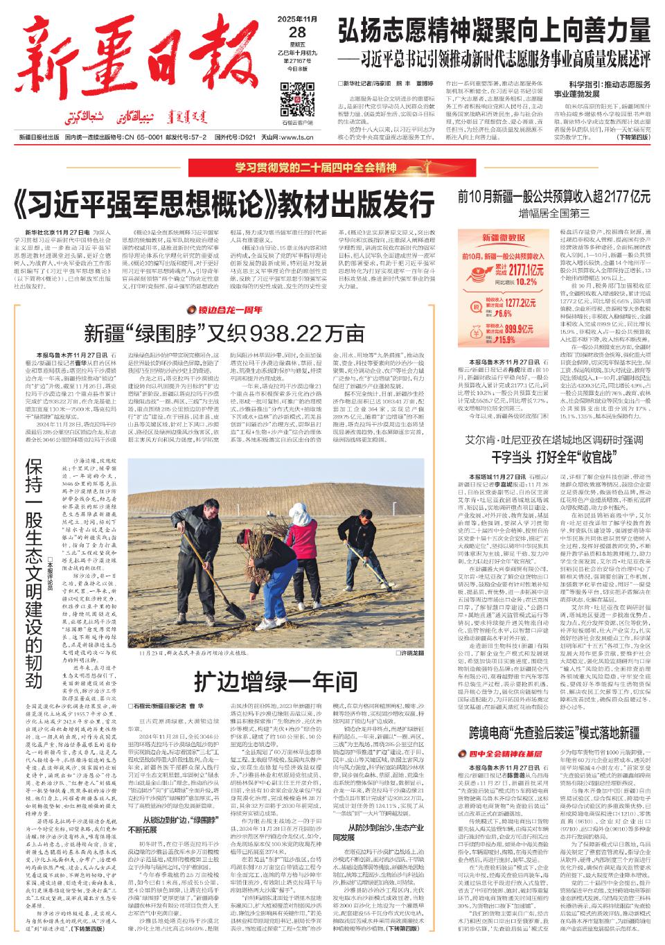 環(huán)著沙漠看新疆,從一個個草方格的堅(jiān)守,一道道綠色長廊的矗立,一條條產(chǎn)業(yè)鏈的延伸中,都能看到從“沙進(jìn)人退”到“綠進(jìn)沙退”再到“人沙和諧”中,破繭成蝶的美麗新疆、日新月異的活力新疆、移山填海的奮進(jìn)新疆。