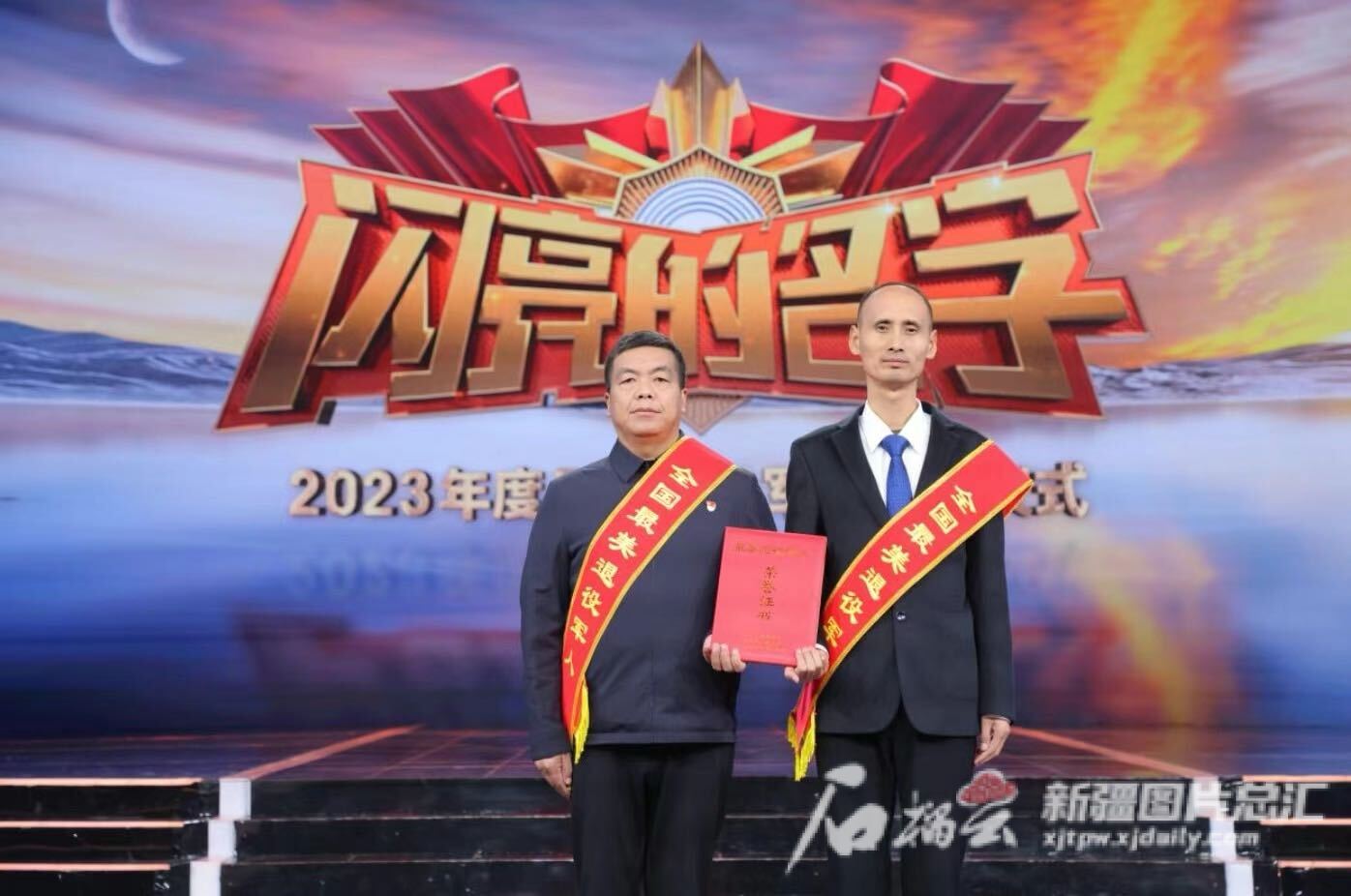 新疆且末縣老兵治沙隊(duì)田野(右)、張宏(左)參加2023年度最美退役軍人發(fā)布儀式。田野供圖