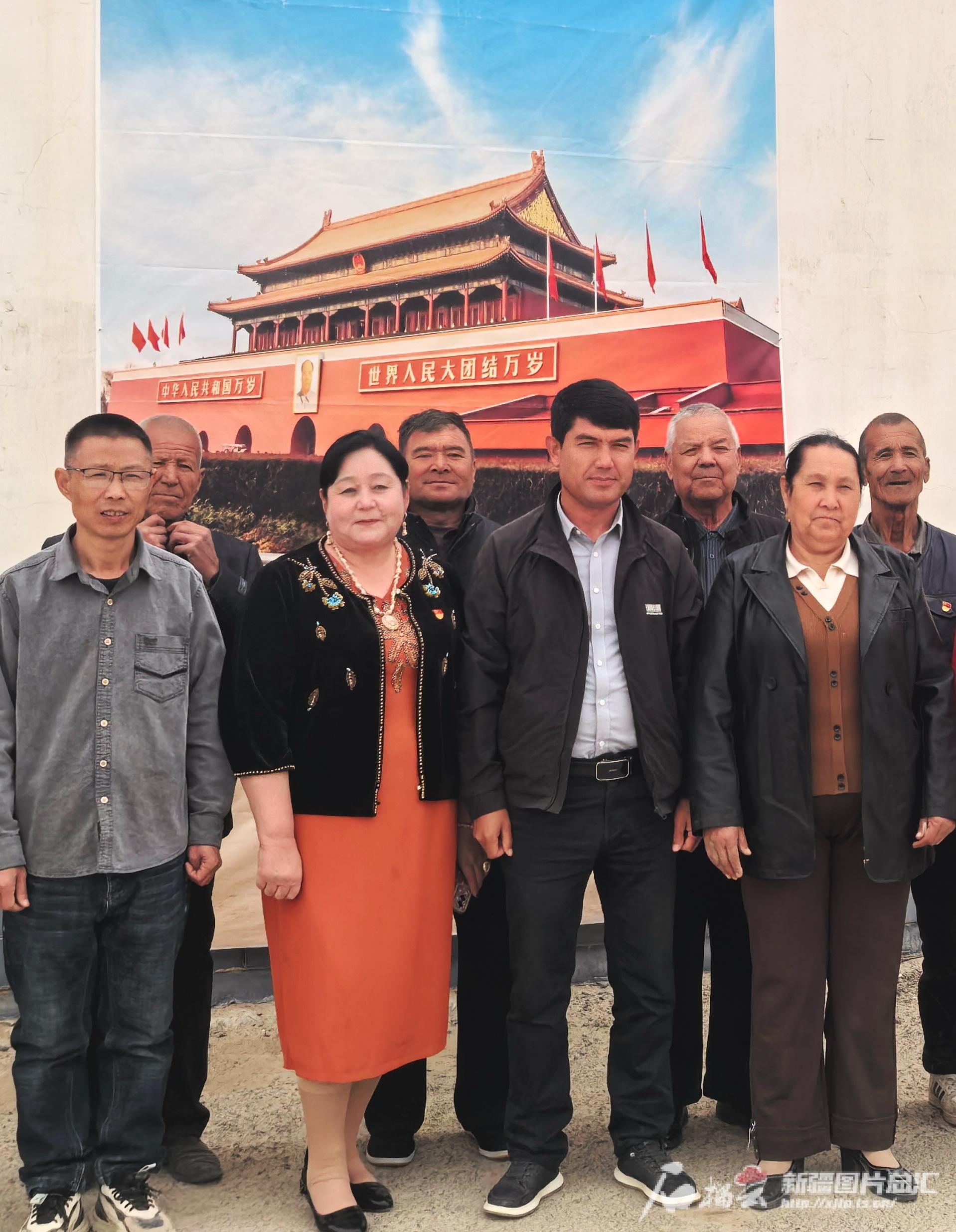 和田縣阿瓦提鄉(xiāng)庫(kù)木格勒村吾爾妮薩罕·麥麥提敏(前排左二)與村干部一起在“天安門”前的合影。胡春芳攝